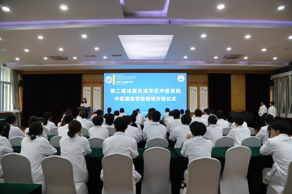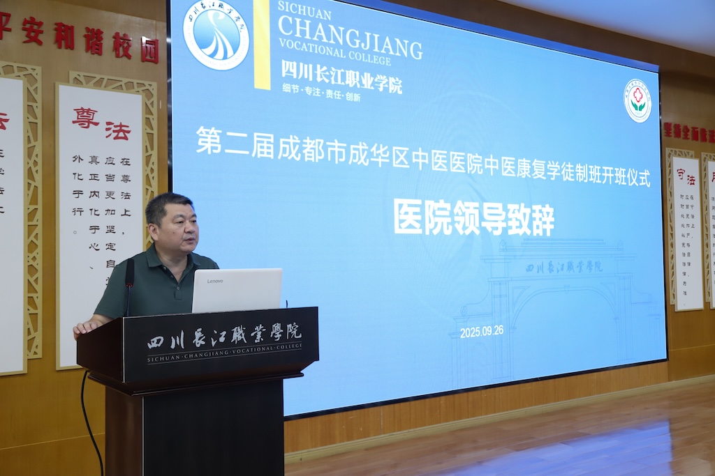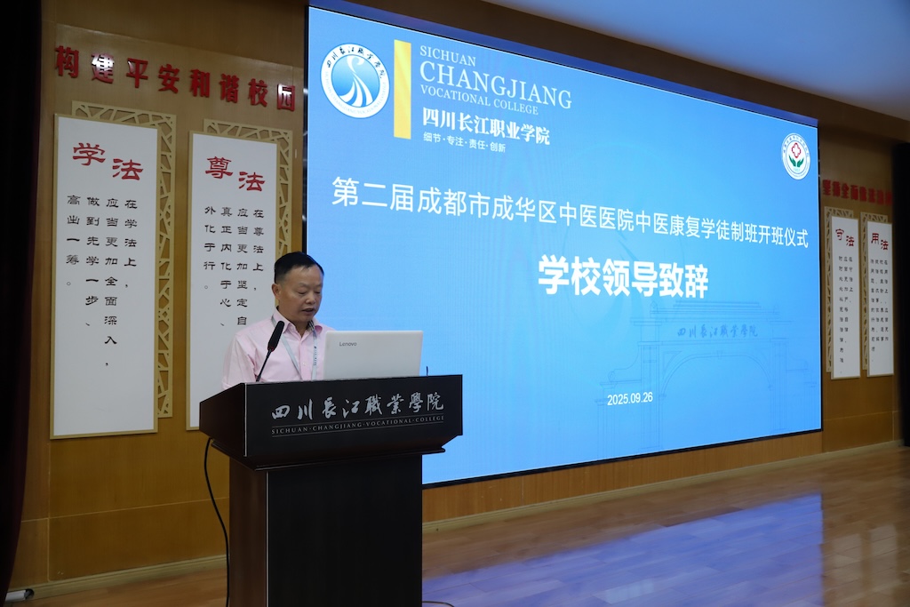 【本网消息】(智慧健康与管理学院 任青逸供稿)2025年9月26日,第二届成都市成华区中医医院-四川长江职业学院中医康复学徒制班开班仪式举行。成都市成华区中医医院副院长李齐煜、科教科科长吴欣怡及5位医师导师,四川长江职院副校长易贤文、智慧健康与管理学院副院长张京杭、大健康系副主任邓良岑及学院相关负责人,与全体学员参会。