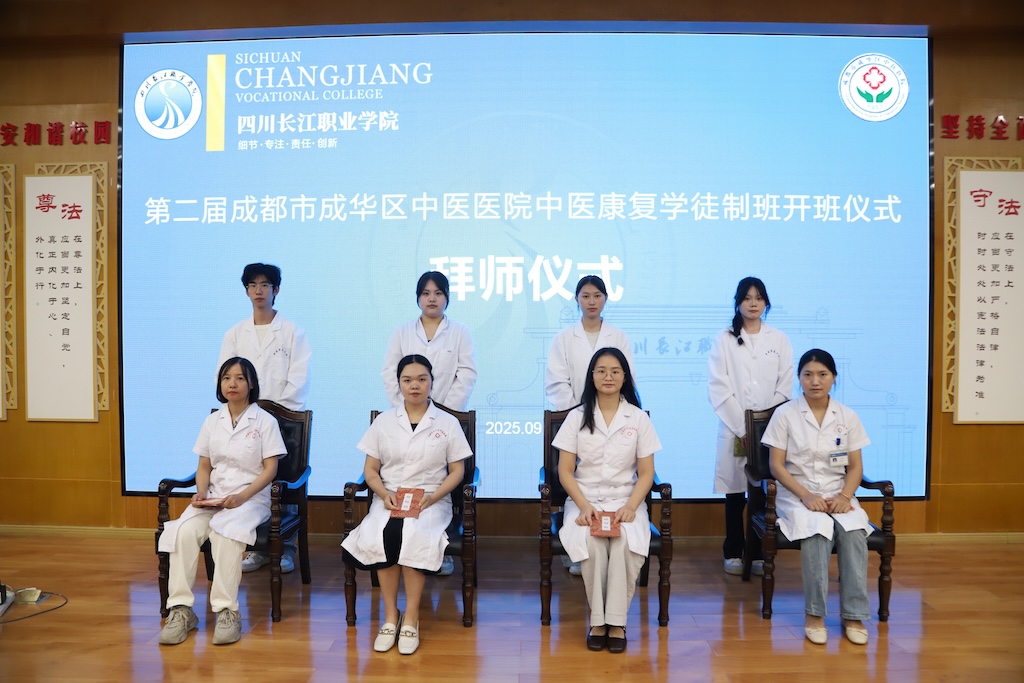 仪式上,四川长江职业学院副校长易贤文、成都市成华区中医医院副院长李齐煜先后致辞,回顾院校合作基础并寄语学员。随后开展拜师仪式,学生代表呈拜师帖传承中医“守正创新”精神;易贤文为导师颁聘书,推动传统中医与现代职业标准融合。导师代表韦婷、学生代表刘美君分别发言,传递育人初心与求学决心;全体师生共同诵读《大医精诚》节选,传承医者精神。