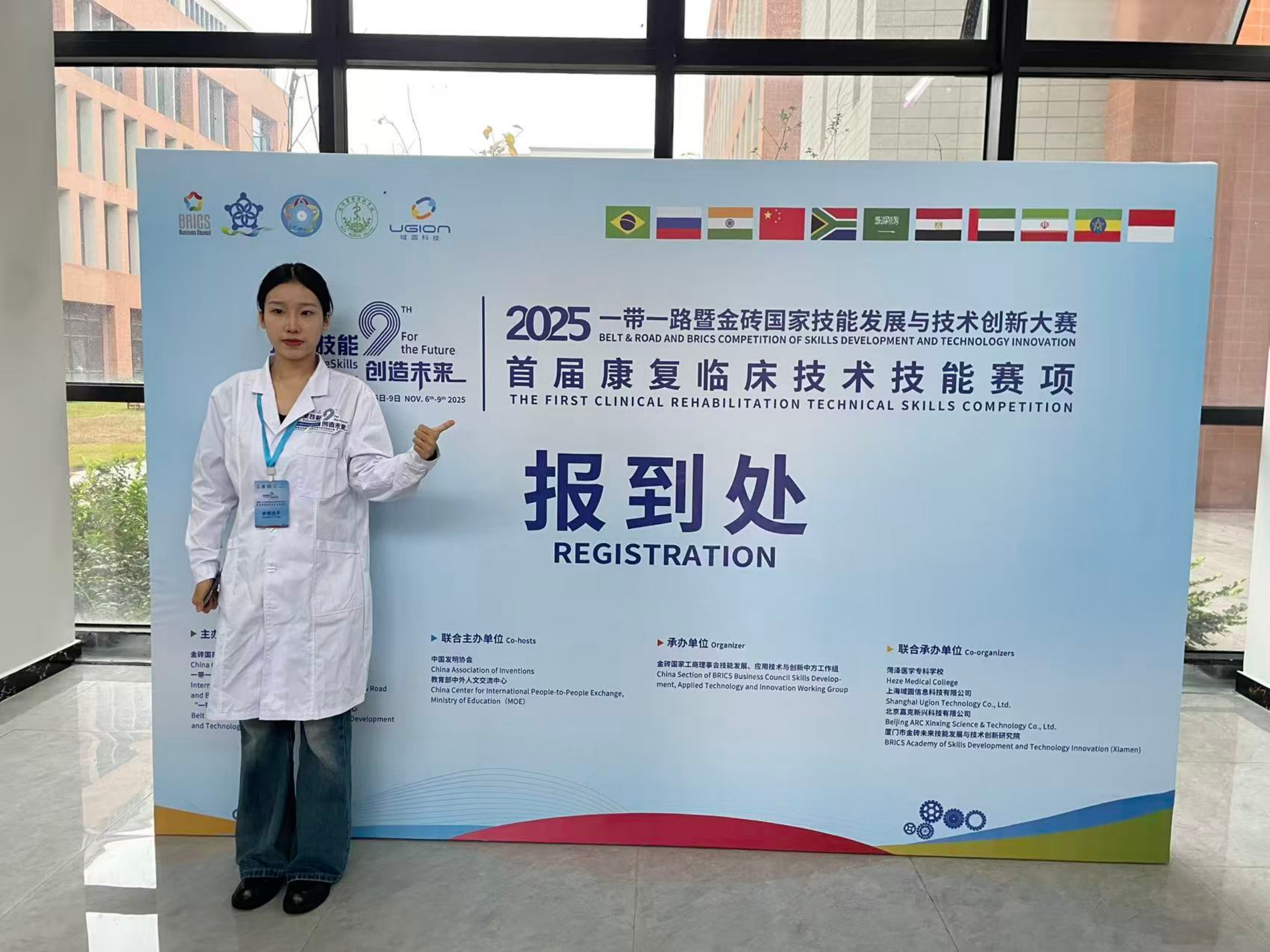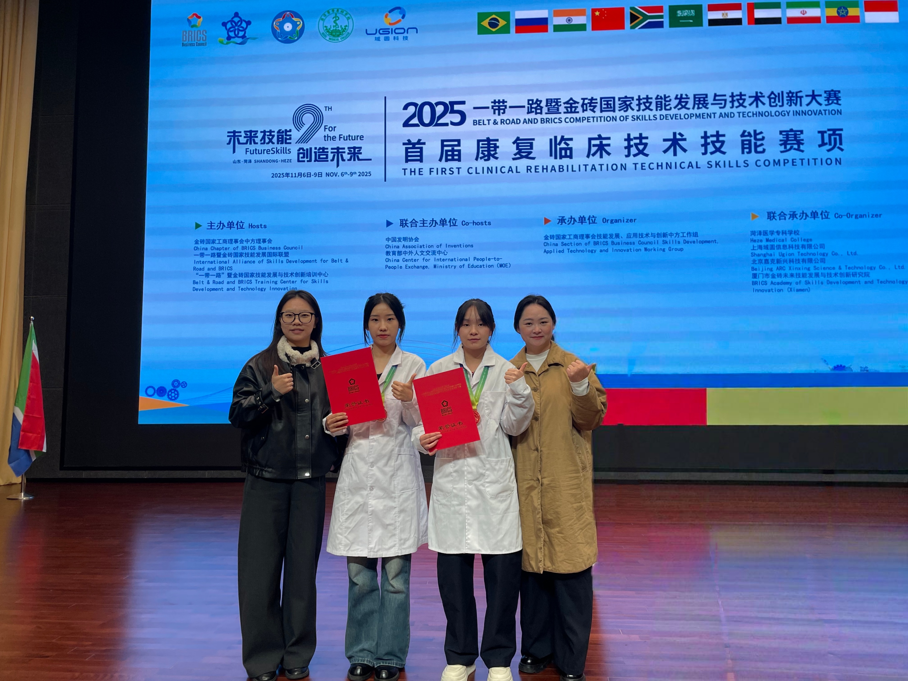 【本网消息】(智慧健康与管理学院 任青逸供稿)近日,2025“一带一路”暨金砖国家技能发展与技术创新大赛之首届康复临床技术技能赛项在山东菏泽圆满落幕。由我校温章燕、任青逸、邓良岑、蒋秀梅老师共同指导的中医康复技术岗位学生鄢世华、邹紫乐,凭借出色的临场表现与扎实的专业技能,荣获大赛高职组三等奖。