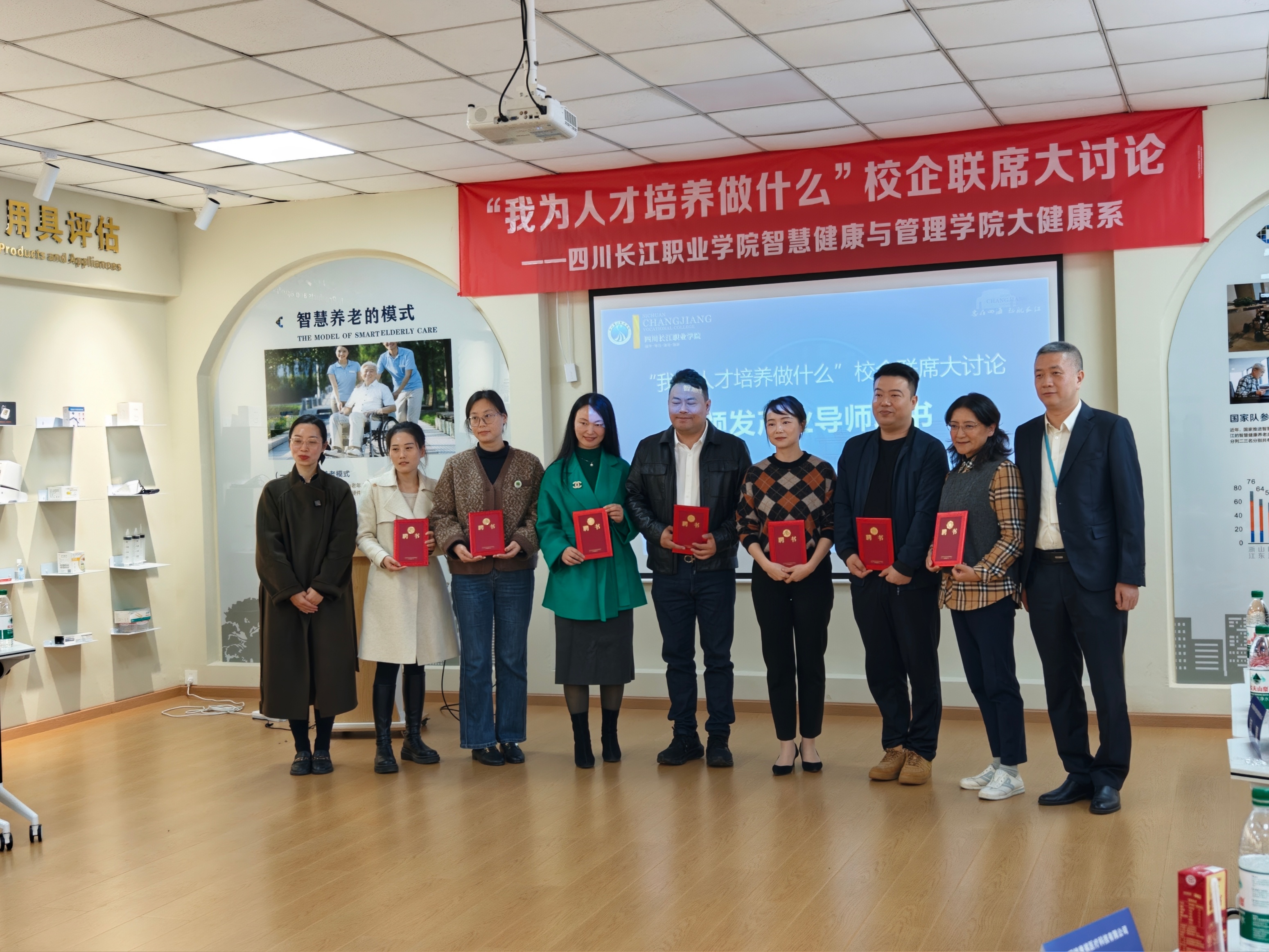 “产教融合建设”主题中,校企双方直面当前行业人才需求,就如何将产业前沿动态融入教学实践展开了热烈讨论。会议提出了“企业需求前置导入教学计划”“校企共建特色实训模块”等具有前瞻性与可操作性的建议,致力于实现课程内容与行业标准无缝对接,企业实践教学与校内培养方案有机融合。在“社会服务”主题中,结合大健康行业特性,明确学院可联合企业开展社区健康科普、老年健康管理、母婴护理指导等服务,通过实践反哺教学,提升学生的社会责任感和综合实践能力,增强学院服务地方发展的能力。在“数字化建设”主题下,企业代表分享了智慧养老、数字医疗等领域的技术应用趋势,建议在教学中将企业数字化运营逻辑、体系及标准化管理模式融入教学,帮助学生掌握现代管理工具。会议最后举行了简朴而庄重的产业导师聘任仪式,进一步夯实了“校企协同、双元育人”的制度基础,为构建长期、稳定、互惠的合作关系提供了机制保障。