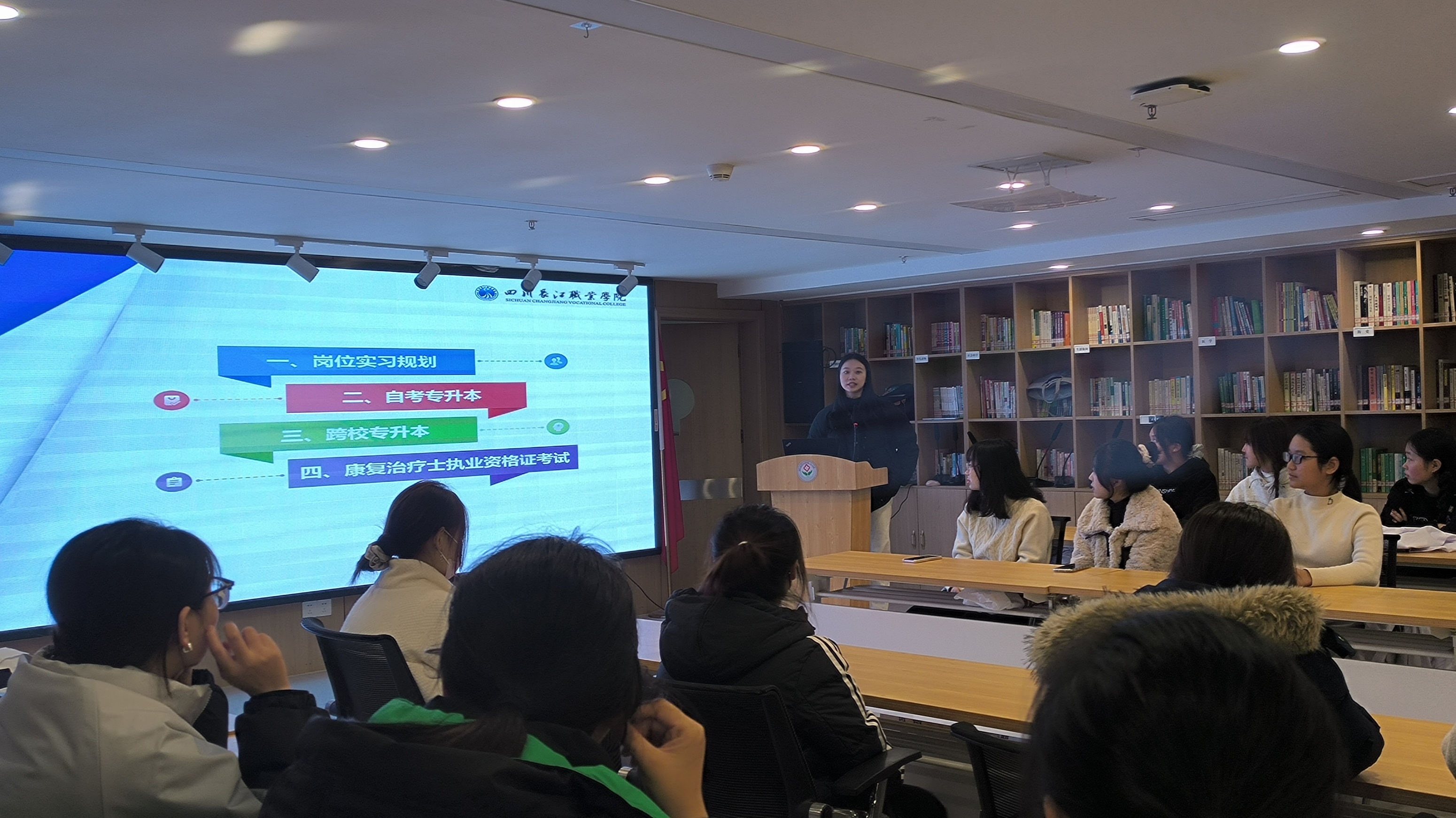 【本网消息】(智慧健康与管理学院 任青逸供稿)2025年11月27日,智慧健康与管理学院大健康系温章燕、任青逸、蒋秀梅三位教师前往成都市成华区中医医院,开展“岗位实习送课上门”活动。此次活动面向我校及合作本科院校成都医学院、成都中医药大学的实习生,围绕岗位实习、证书考取、就业方向等内容展开深入交流。