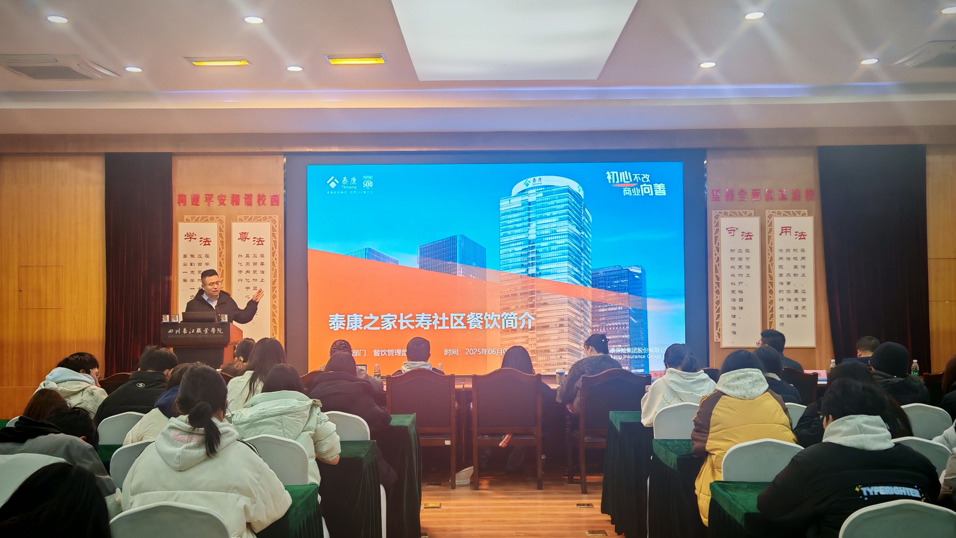 【本网消息】(智慧健康与管理学院 罗鸣供稿)2025年12月9日,智慧健康与管理学院烹饪工艺与营养专业、酒店管理与数字化运营专业与泰康之家蜀园联合举办的泰康订单班校企合作宣讲会在行政楼第三会议室顺利召开。泰康之家蜀园餐饮服务部总监乔子超、蓉园餐饮服务部总监曾小刚、行政总厨李伟、人力资源部代表、智慧健康与管理学院院长助理黄思思、公共管理系主任助理刘琳琳、专业教师及百余名学生参会。
