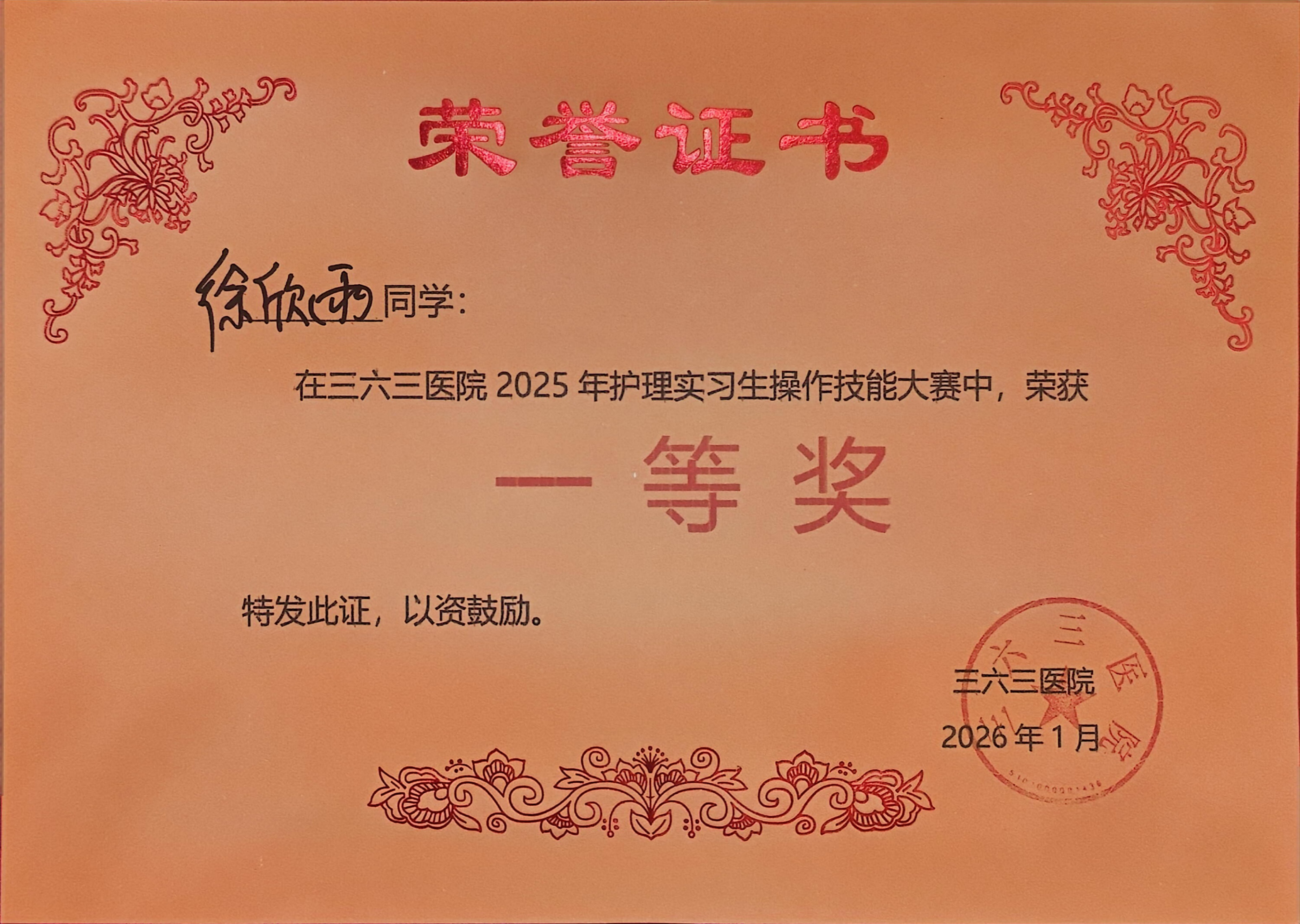 【本网消息】(智慧健康与管理学院 刘杨供稿)近日,三六三医院成功举办了年度实习生临床技能大赛。来自智慧健康与管理学院大健康系护理专业的实习生徐欣雨、吉使伍呷凭借出色的专业表现,在众多优秀竞争者中脱颖而出,分别荣获大赛一等奖与三等奖。其中,徐欣雨同学在心肺复苏项目比拼中表现尤为出色,斩获该项目一等奖。