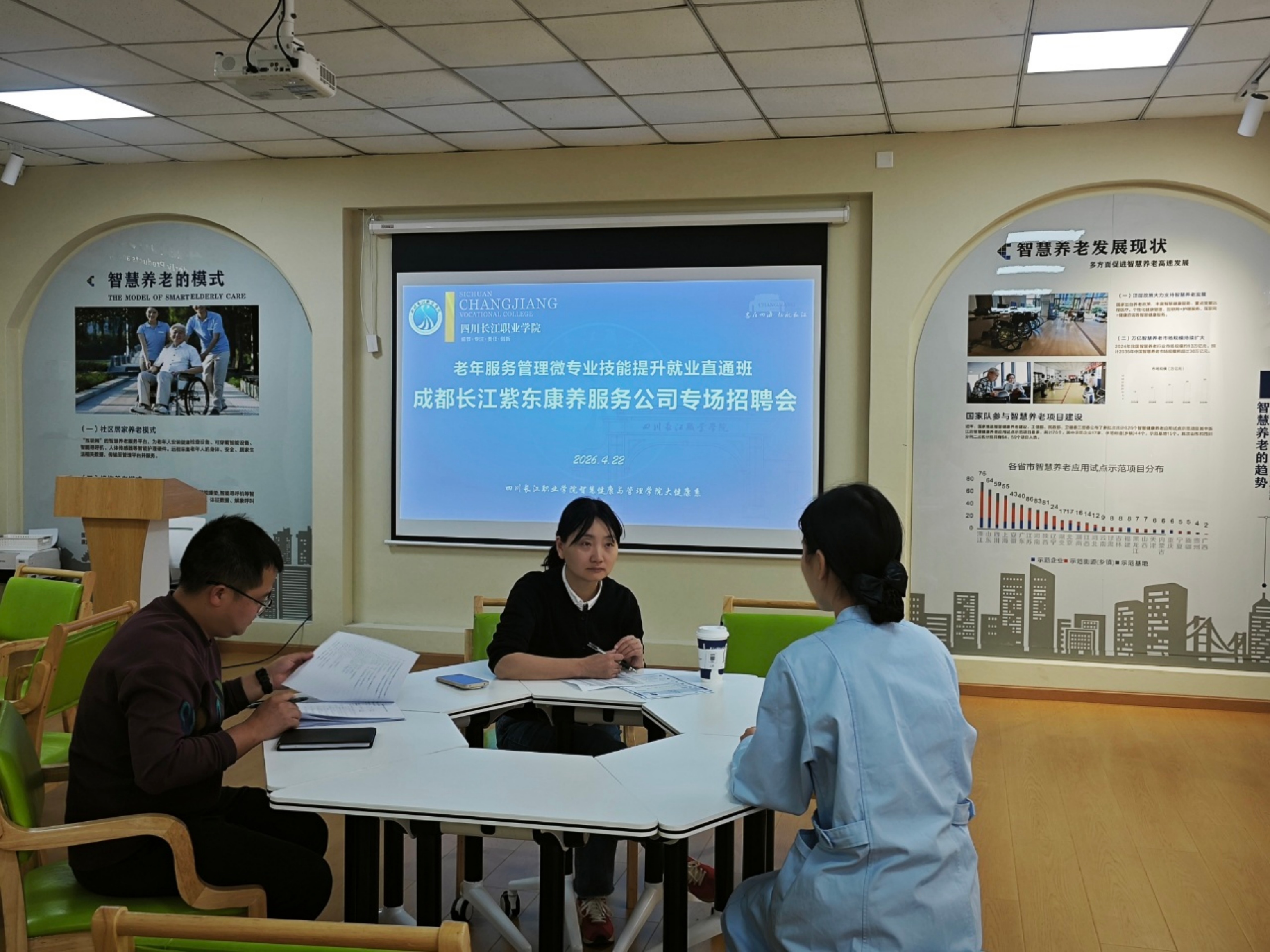 【本网消息】(智慧健康与管理学院 张丹供稿)为深入贯彻落实养老服务人才队伍建设战略,推动教育与产业无缝衔接,4月22日,老年服务管理微专业“技能提升就业直通班”专场招聘会在3206教室隆重举行。成都长江紫东康养服务公司护理部刘主任与聂老师应邀莅临,面向直通班学员开展定向人才选拔。